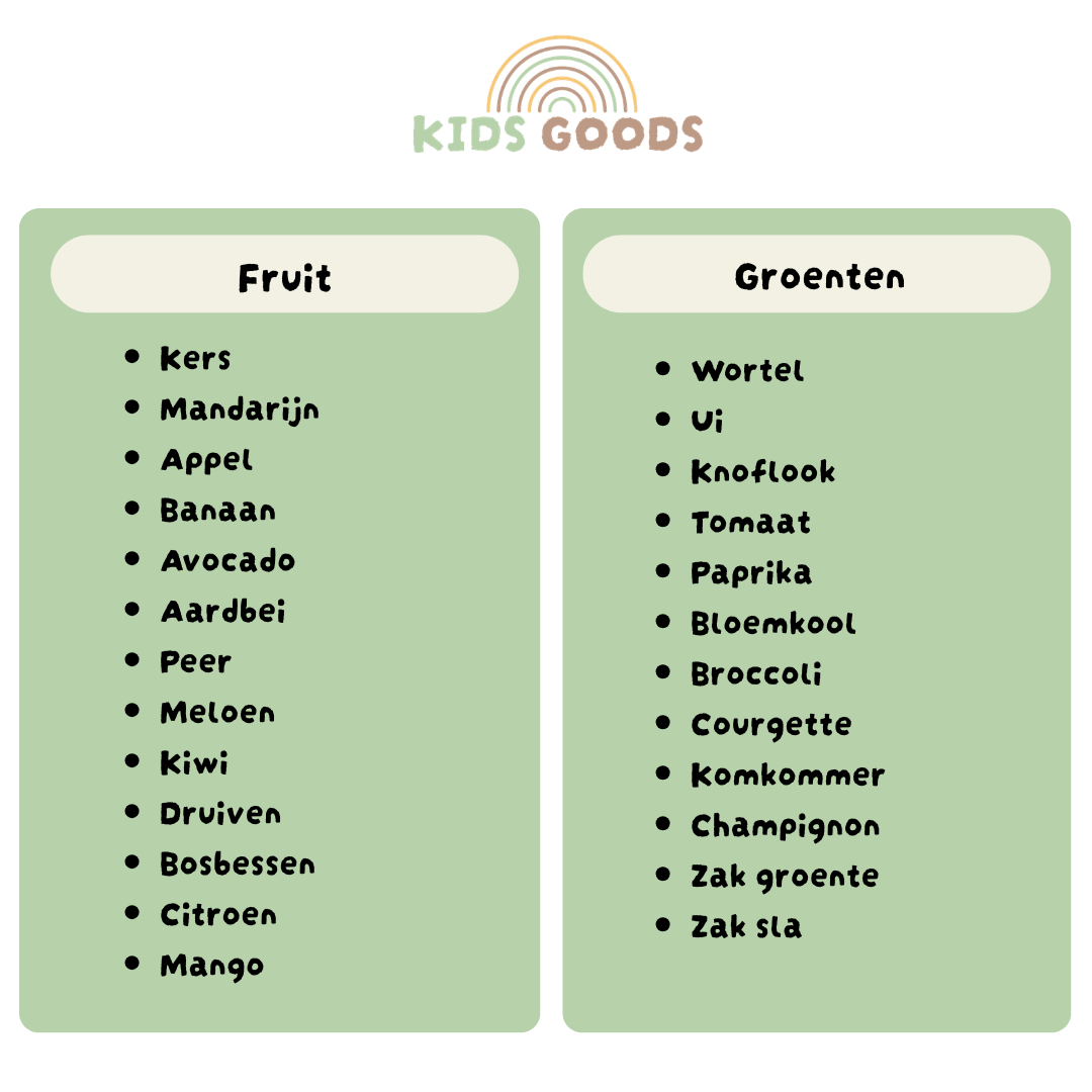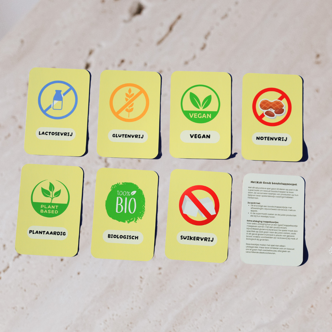 80 spelkaarten met 7 koppelkaartjes die zorgen voor extra uitdaging en leren kinderen bewust omgaan met verschillende productvarianten zoals biologisch en suikervrij.